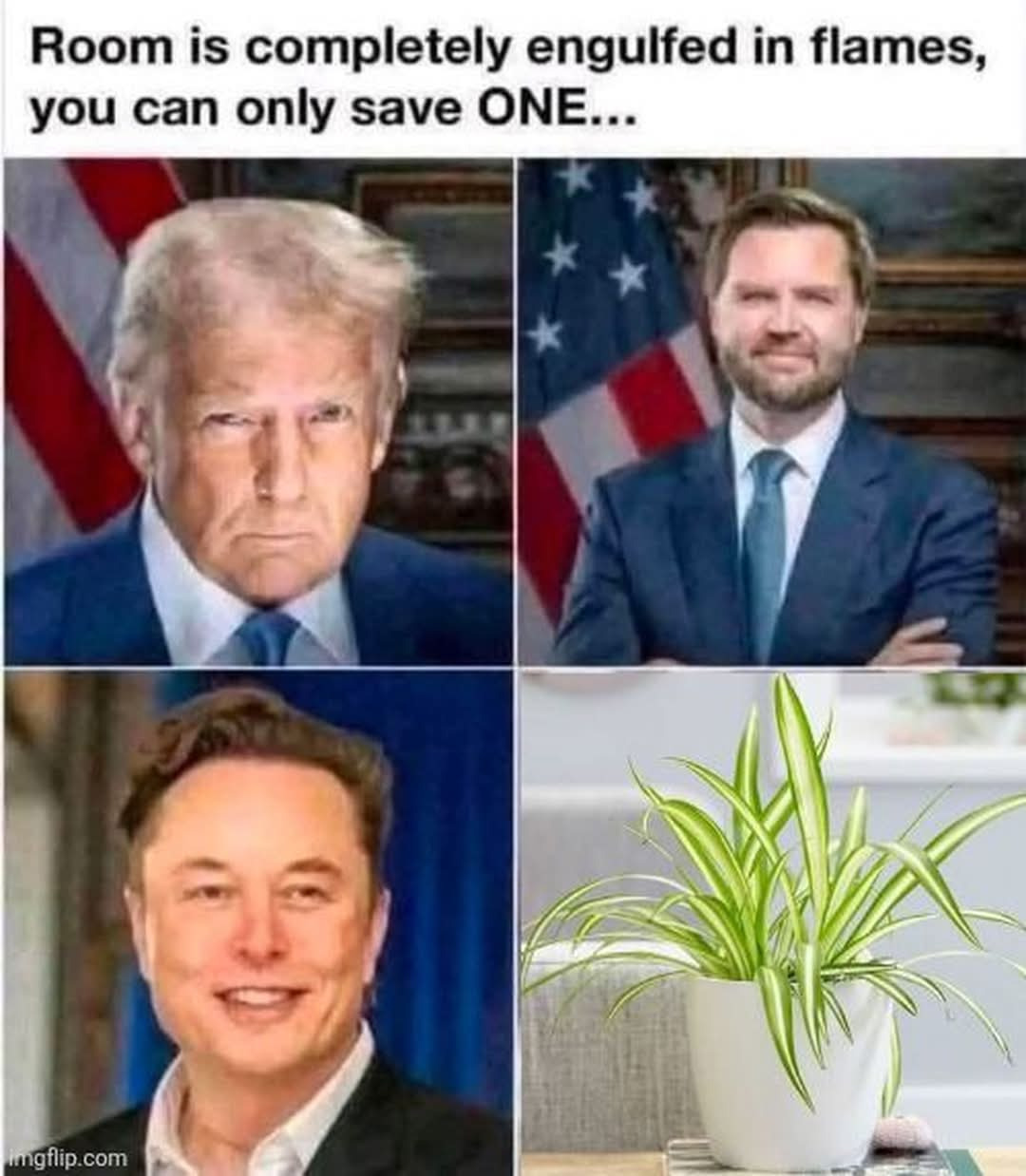If they see me saving the plant and myself, I think the only real fight to stop me would be with Elon. Trump is too old to chase after me. Vance is too busy fucking a couch. Elon, he has some body flabs, but I would not underestimate him.