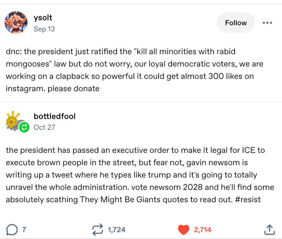 All I see is that you guys complain that democrats don’t fight back against trump and the moment one does, you guys tear them down and shit on them. I see Trump being a dictator and you guys still blaming democrats, the Dems you refused to vote for. All I saw was you guys demand the old white man step down, and the moment you saw him replaced with a black woman you all went “eeew I rather have trump” And these posts just say “I still prefer trump”