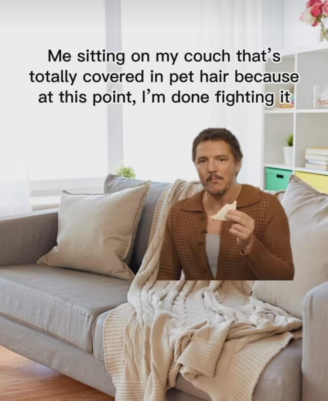 And that’s why I have leather couches. You don’t see the hair until you need to move the cushions, then you have little mountains to vacuum up. Or, put the cushion back down and watch your living room turn into a snow globe