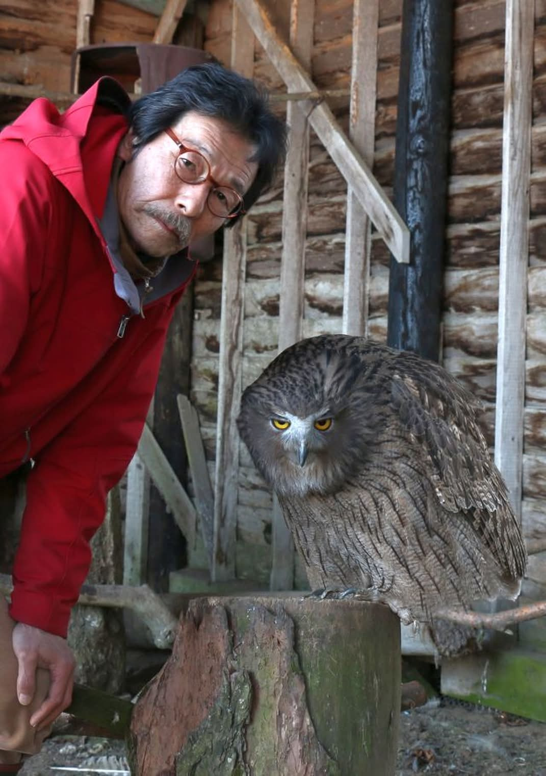 Photo of Sumio Yamamoto with the real Don, a female Blakiston’s Fish Owl that he used for research, conservation and education for 26 years.