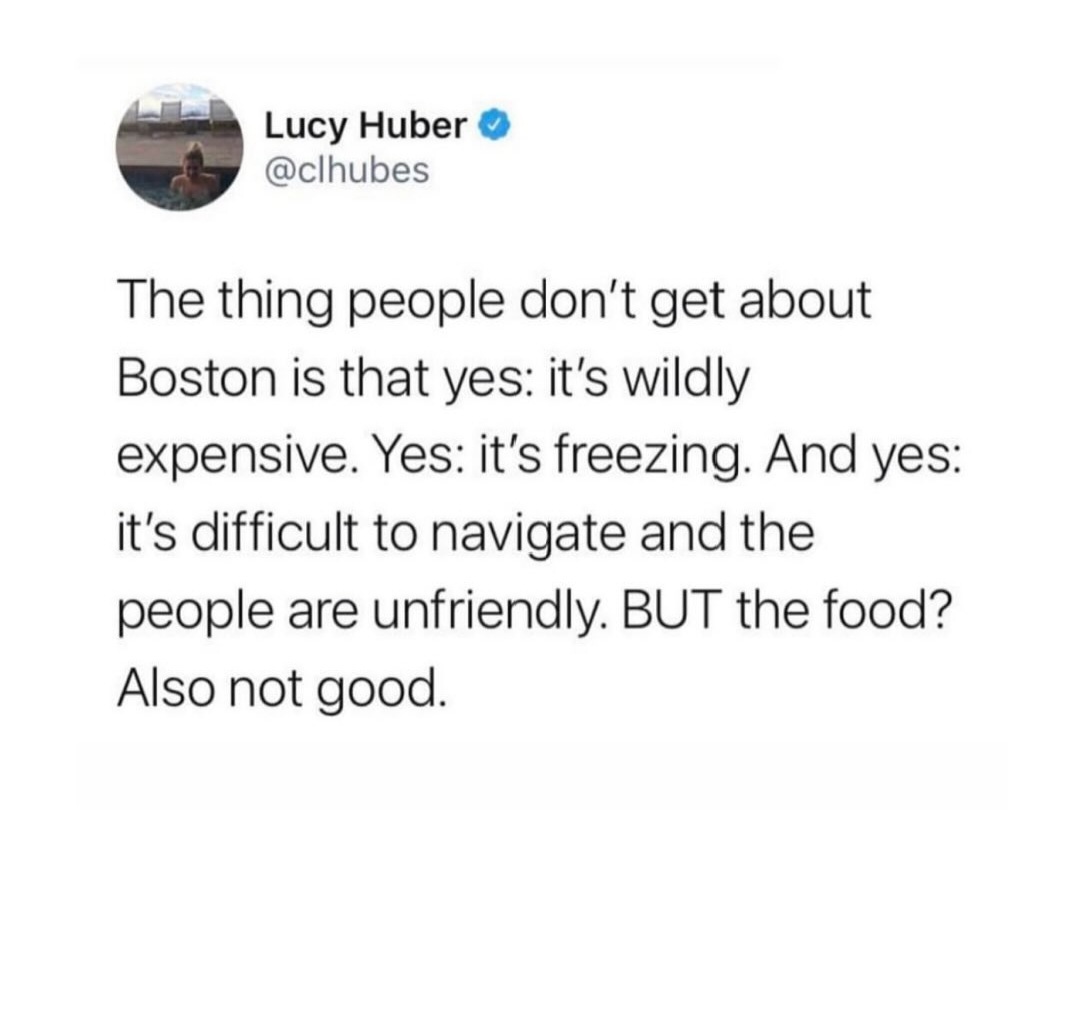 More than just good food. The North End alone is full of world class culinary institutions. Everything else is right enough for a meme but the food line couldn’t be more wrong.