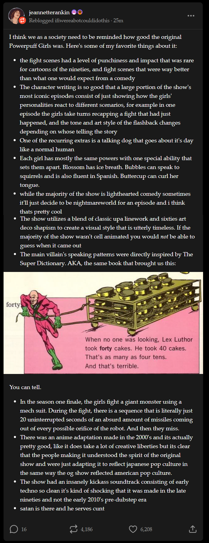 Also, I forgot about the episode where Mojo Jojo does community service at a community college, teaching English, and somehow the whole town gets stuck with his very verbose speech patterns somehow. The show knew when to be absurd in such a great way.