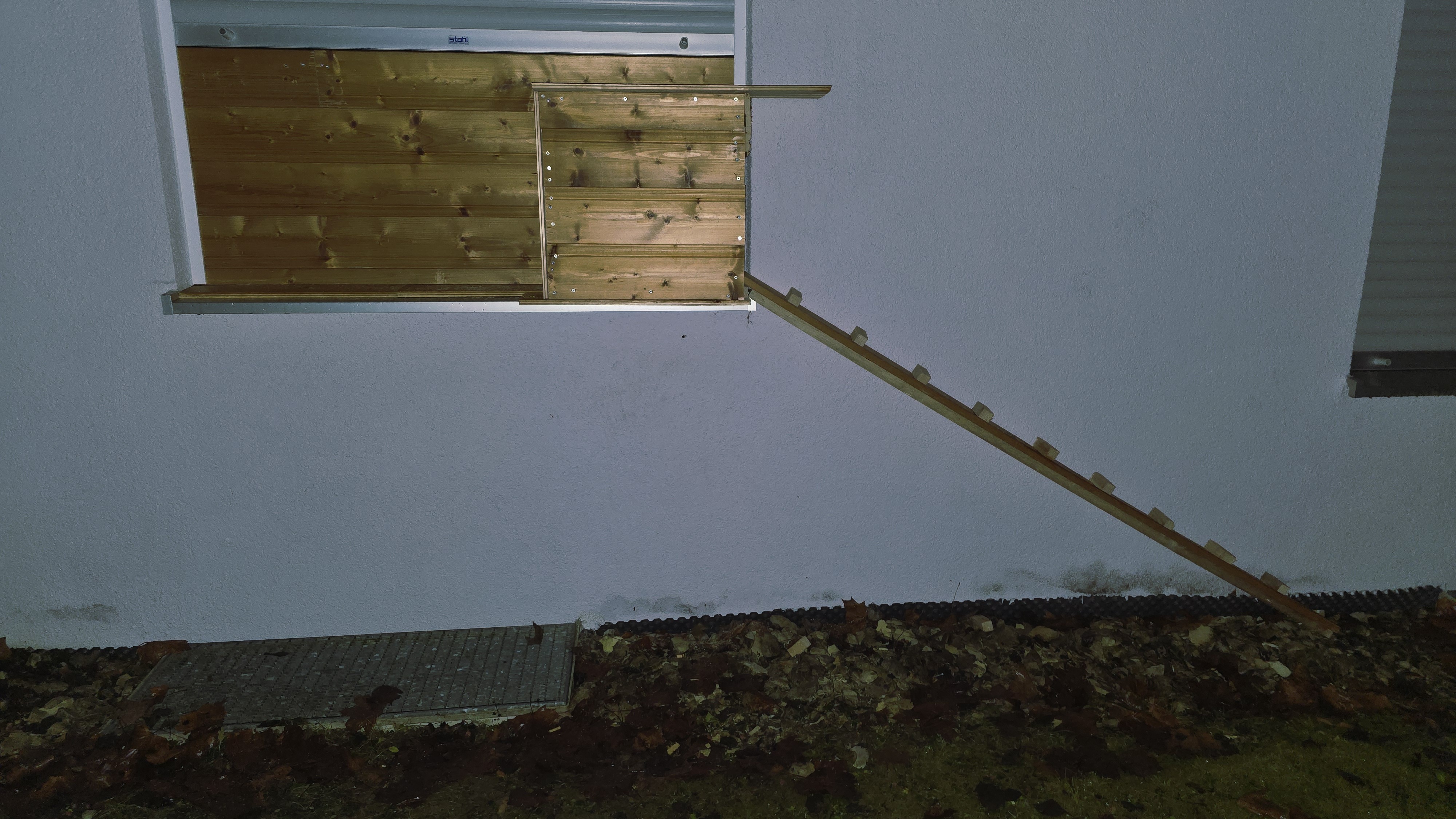 Nachdem ich endlich verstanden habe, dass meine Miez nicht auf das etwaig nasse Fensterbrett hüpfen möchte, also habe ich ihr eine Katzentreppe mit Durchgangsschleuse gebaut.