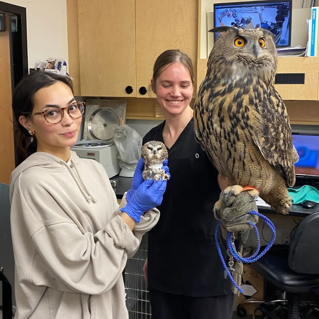 Owls come in all sizes! We could not resist the opportunity to compare the size of the northern saw- whet owl, weighing 104 grams, to the Eurasian eagle- owl, weighing 2900 grams. And yes- both birds are fully grown!