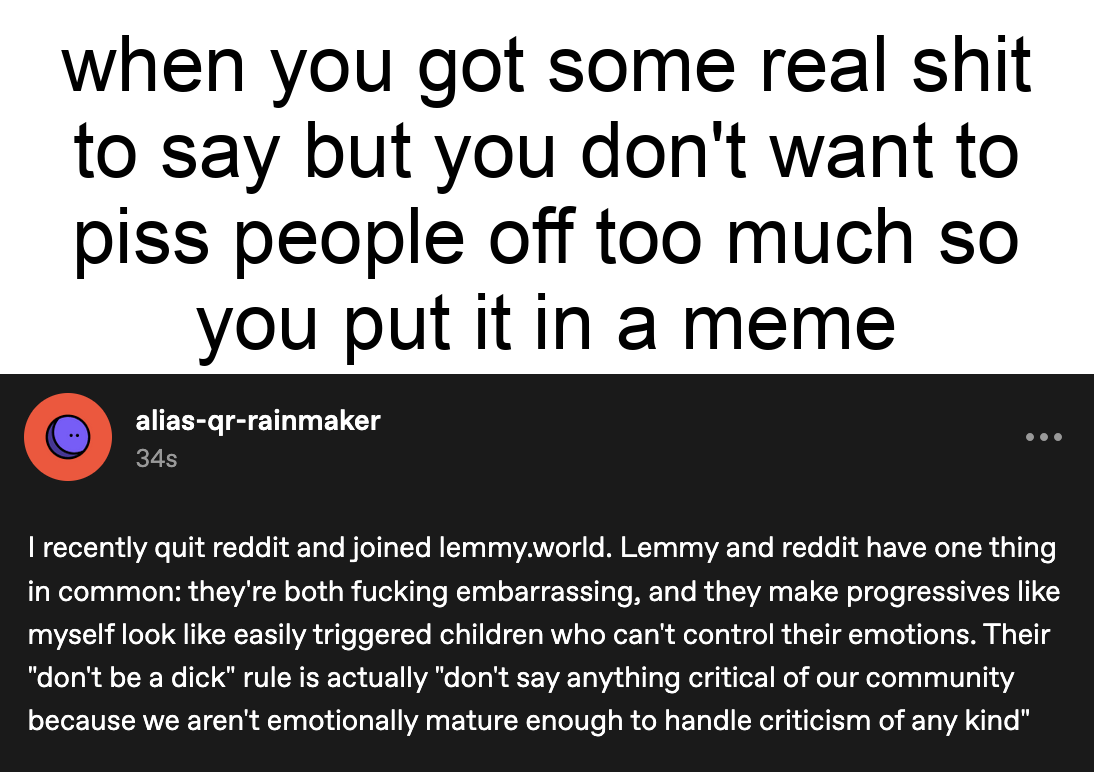 And it’s usually argumentative people with an agenda to disrupt and fracture communities who conflate rules of civility with overbearing mods who “can’t handle my truths”.
