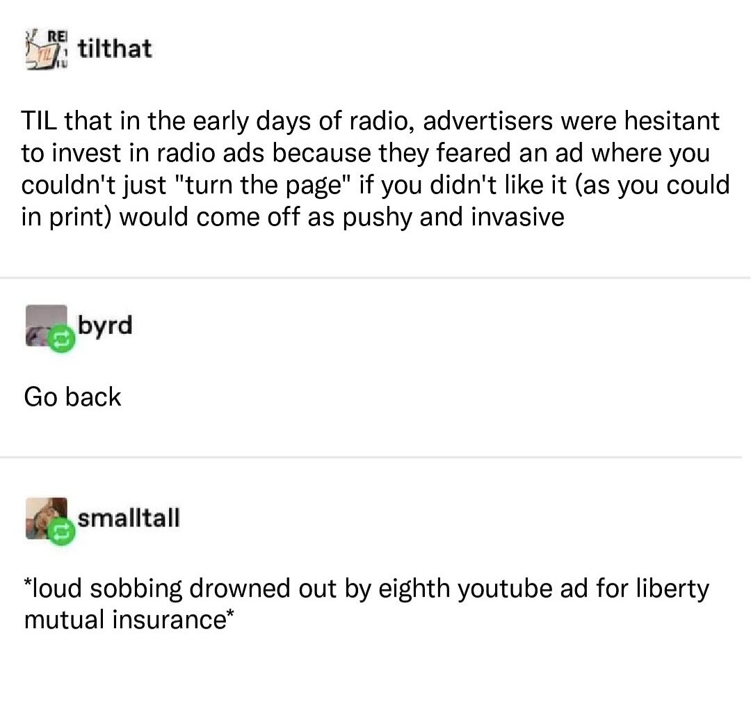 Then they went with just having the radio performers do the ad in the middle of the show, and we’re back to that again with youtubers sticking ad reads in the middle of their videos…
