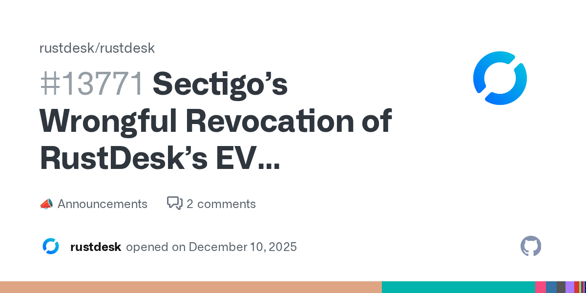 Sectigo’s wrongful revocation of RustDesk’s EV certificate is not simply an isolated error — it highlights a structural vulnerability in the certificate trust ecosystem. […] This incident must not be ignored. It is a warning that the certificate authority model needs stronger accountability and oversight.