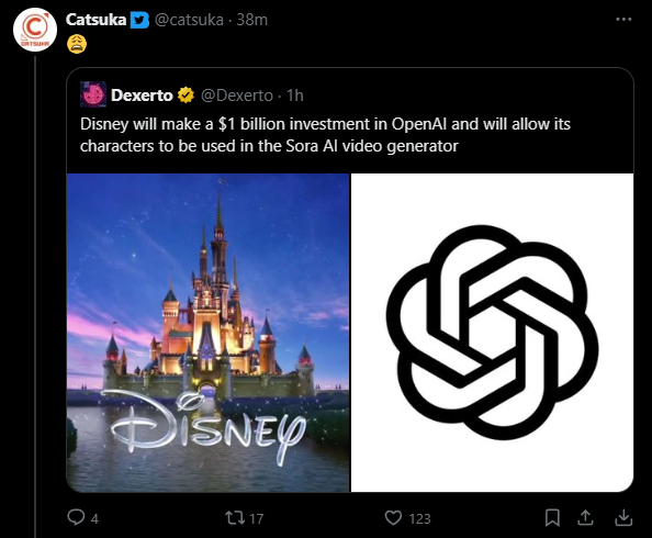 arrow-up1484arrow-down1imageDisney -- the most powerful entertainment corporation and also one of the most unforgiving IP owners on earth throws all of its lot onto OpenAIlemmy.worldlechekaflan@lemmy.world to Fuck AI@lemmy.world · edit-216 hours agomessage-square82fedilinkfile-text