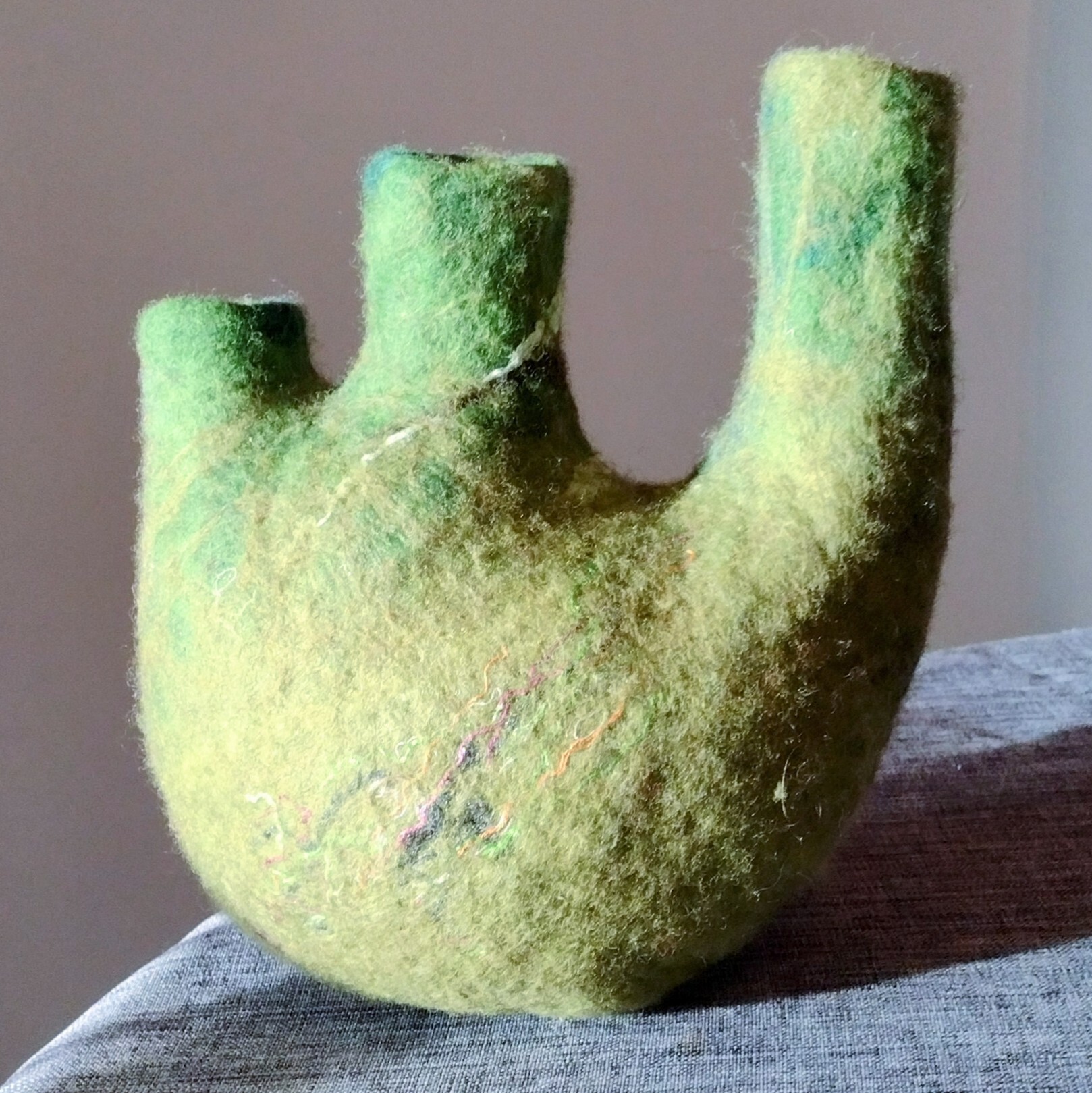 Wet felted wool on a form I cut out of a reusable shopping bag, roughly 10" high x 10" long x 6" wide. Cotton embroidery floss and cheesecloth added for colour and texture, more visible on the other side, but I prefer this side. The dirtier green was dyed with peppermint. I used a mix of corriedale and unlabeled, rougher sheep wool I get in a giant discount bag. At least I think it came from a sheep…