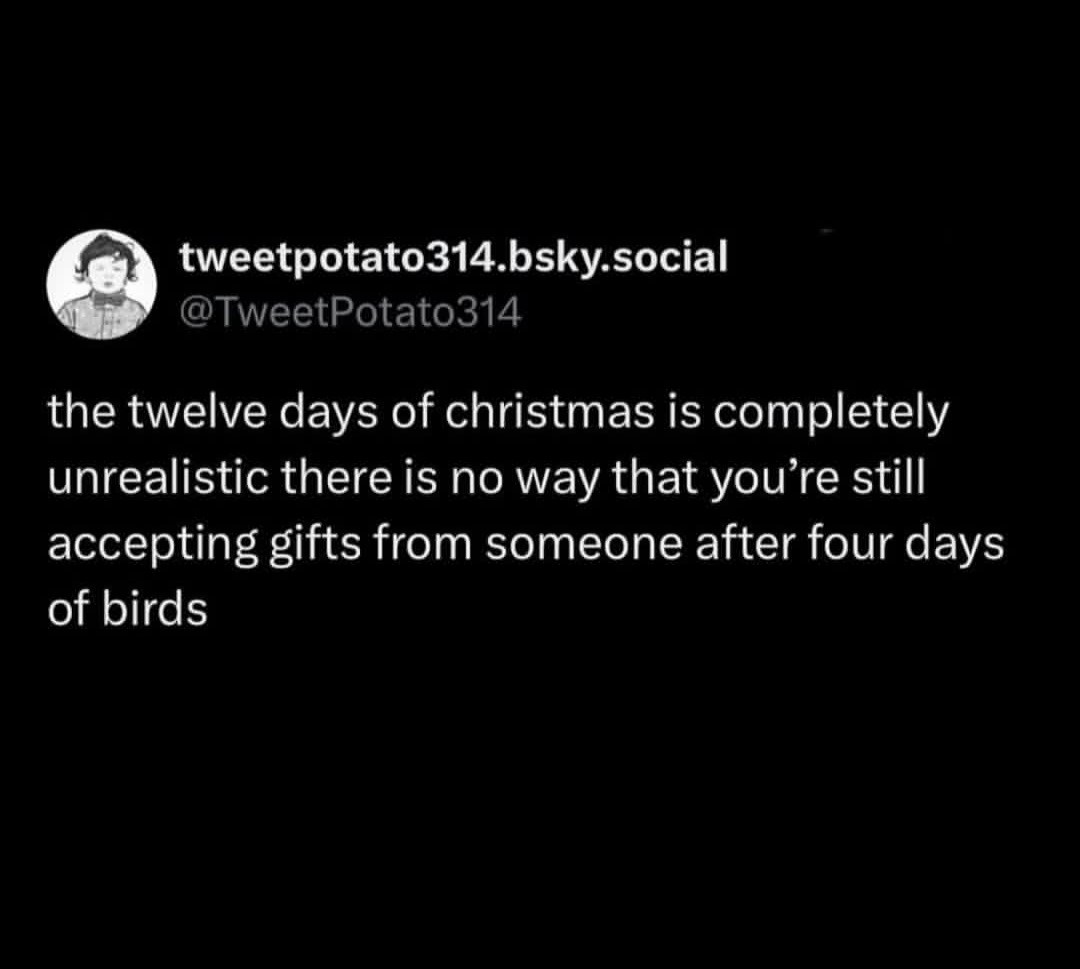 Bro, it’s 12 days full of fowl. It’s birds all the way down. Like some seasonal 12 layer turducken.