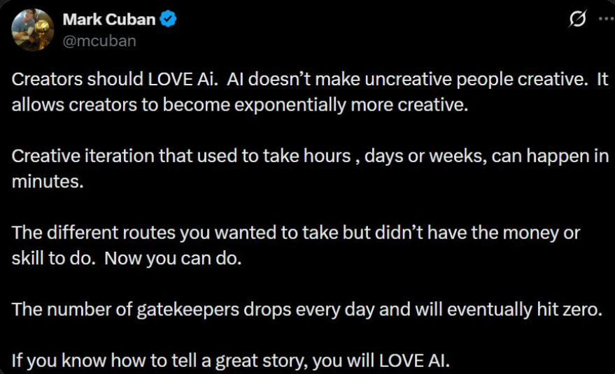 Love that he thinks “if you know how to tell a great story you will love AI.” The whole point of AI is to cut out the telling a story part. In reality it’s “if you think you have a good idea for a story but don’t know how to tell one you’ll love whatever the AI spits out.” People who know how to do creative things don’t need AI to do it for them.