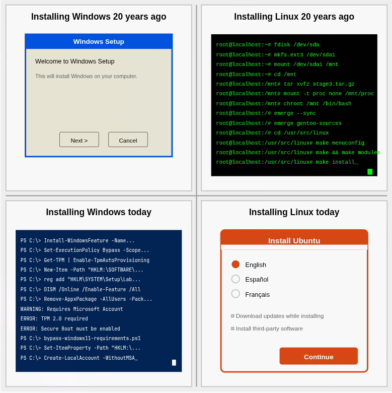 Panel 4: “Installing Linux today” screenshot of install wizard with just a couple buttons