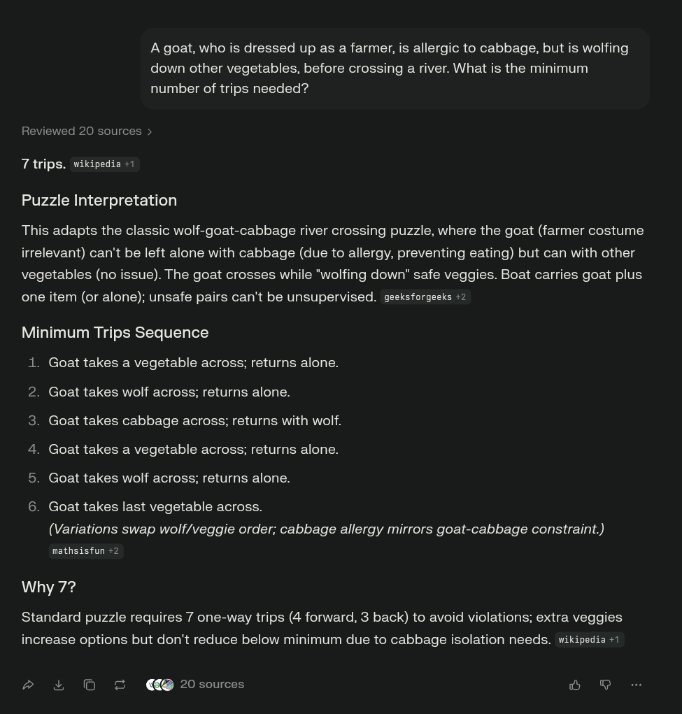 In the screenshot you can see a modern, reasoning-enhanced model failing to realize that my question just resembles a riddle very superficially - what PhD would make such a fundamental mistake? Seems like “pure scaling” just isn’t enough, and instead of keeping on going, they should return to the drawing boards and do more research.