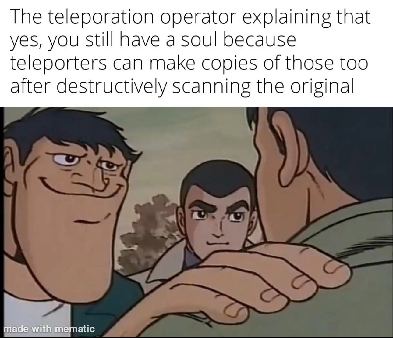 Well I’m pretty sure it’s impossible technology so it’s not upending anything, but mostly I just don’t think the “self” is as rare and precious as a bunch of people seem to.