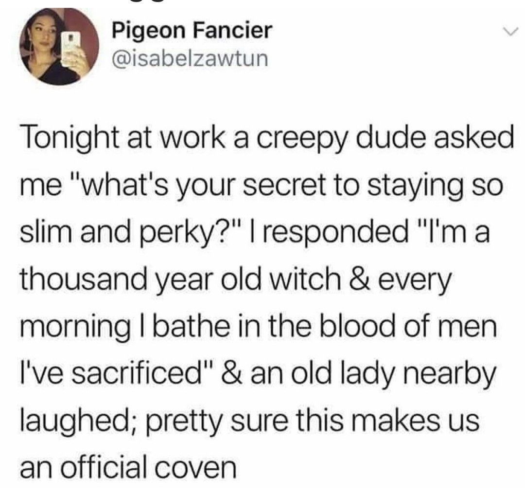 I had a customer tell me once that he could always recognize me from behind because I’m so skinny. I didn’t have a comeback, because what the fuck, but I told him that was something I didn’t want to hear from him and then he got all offended. He told me it was rude, so I told him next time he could recognize which barista was rude.