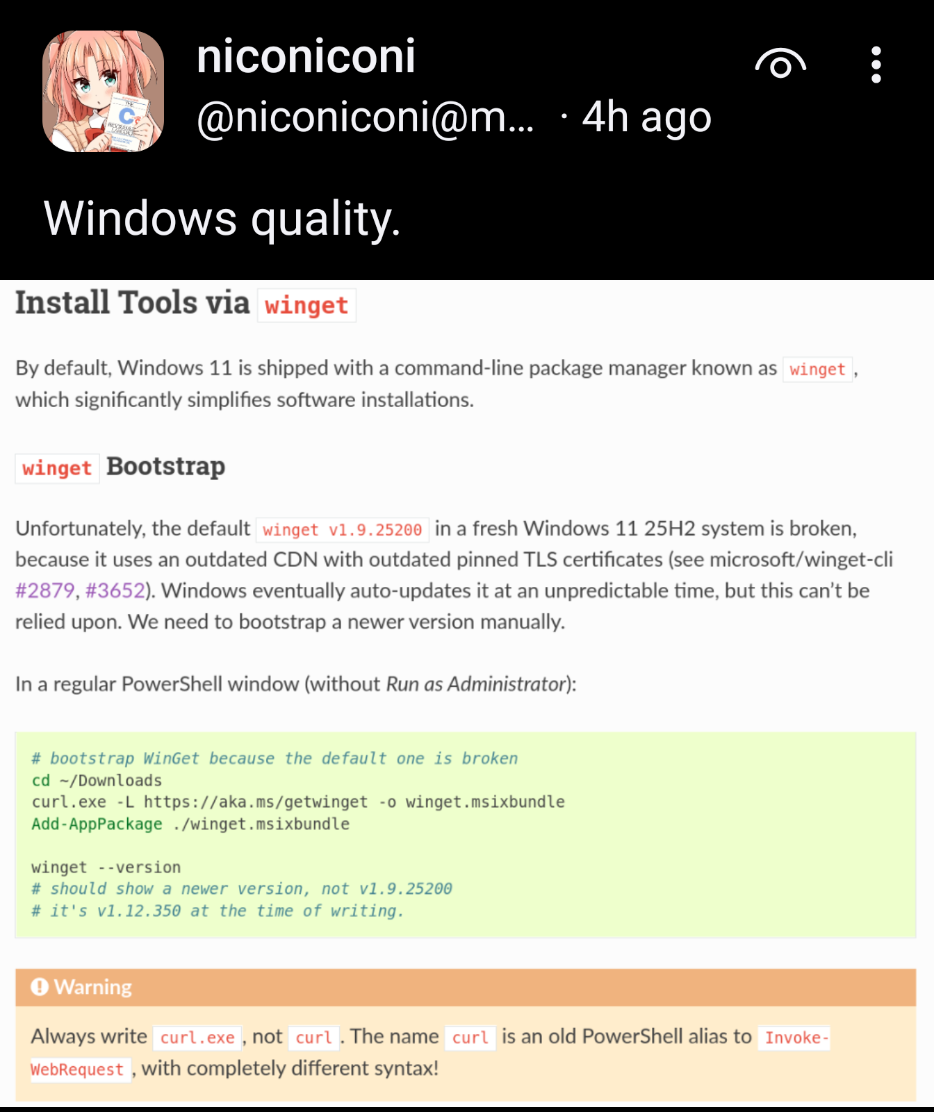 minus-squareapftwb@lemmy.worldlinkfedilinkEnglisharrow-up15·17 days agoSee the bottom of the image. They aliased it to something called Invoke-WebRequest