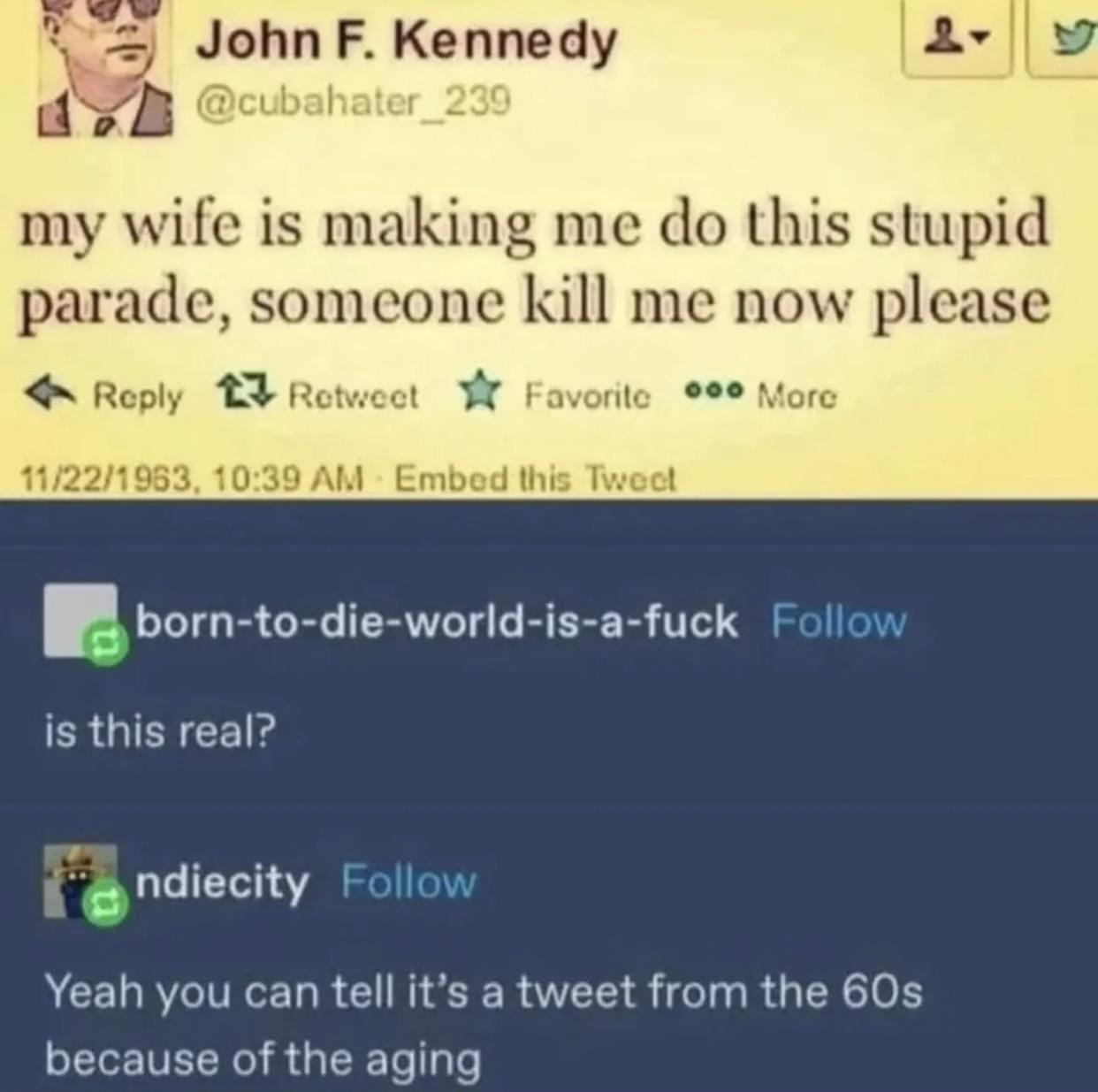 minus-squareHairyHarry@lemmy.worldlinkfedilinkarrow-up22arrow-down2·2 months agoTo their defence: Maybe they thought this was a real quote JFK actually said, and not a tweet from the 60s. Harry’s Razor: Never attribute to stupidity that which is adequately explained by misunderstanding.