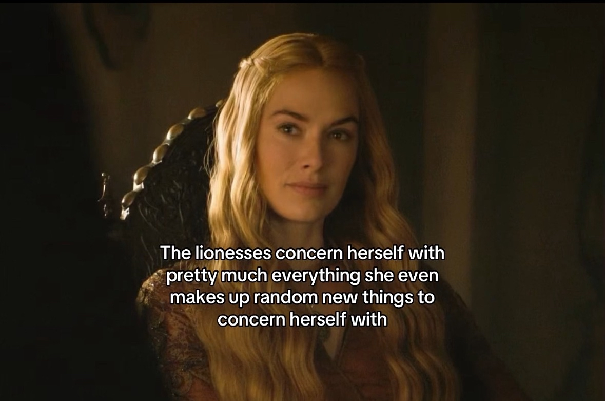 I honestly thought this was a joke about this character specifically. It didn’t come off as “dumb woman annoying” to me, it came off as an in-joke about how this character. I didn’t watch GoT but obviously we all know bits about it by osmosis, I thought one of the main things about Cerci was that she is like, super paranoid and reacts to plots that aren’t there, sort of a Caligula/Nero type? Or maybe Tiberius I guess, I don’t know how malicious she was written as.