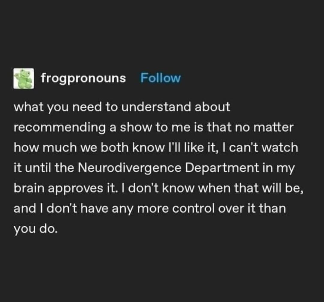 This is me with wearing new clothes. My wife knows my tastes, she always gets me clothes I love. But it can take me up to a few months sometimes to start working them into my rotation. I don’t know why. I already know I like the new shirt, but the ones I’m already used to won’t make way for a while