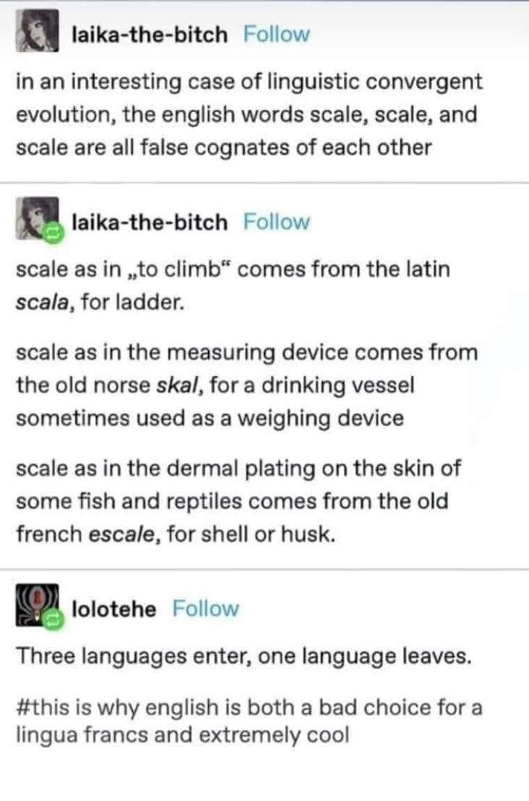 I’m wondering if scale, as in the crud that can build up on certain materials under certain conditions, is simply derived from the fish scale sense. It would seem like it, since it’s the ‘shell or husk’ Otherwise, yay, a fourth meaning!