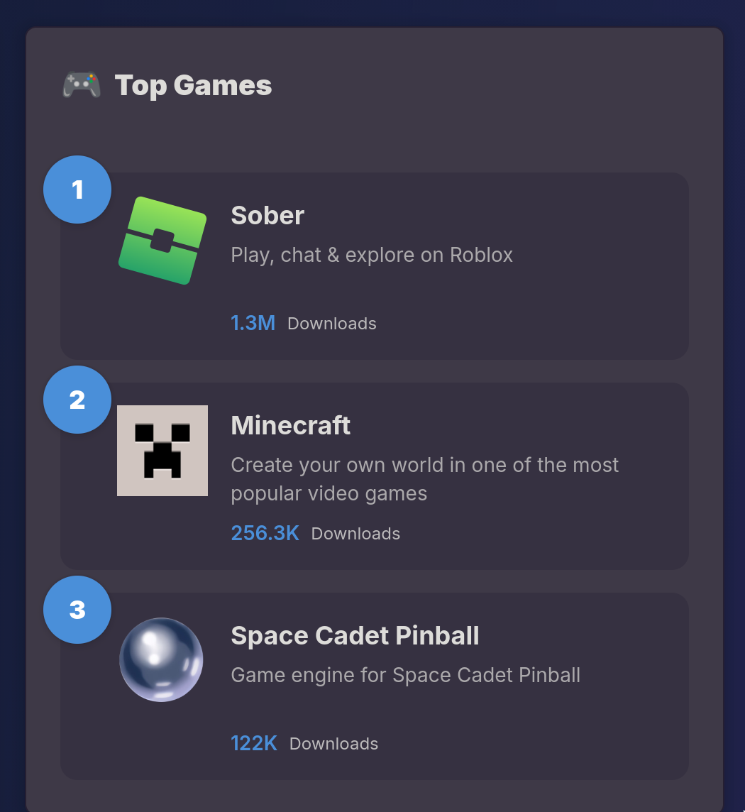 Oh, looking at the actual page shows Prism Launcher with 606.7K downloads, just under the Top Game Tools section rather than Top Games.