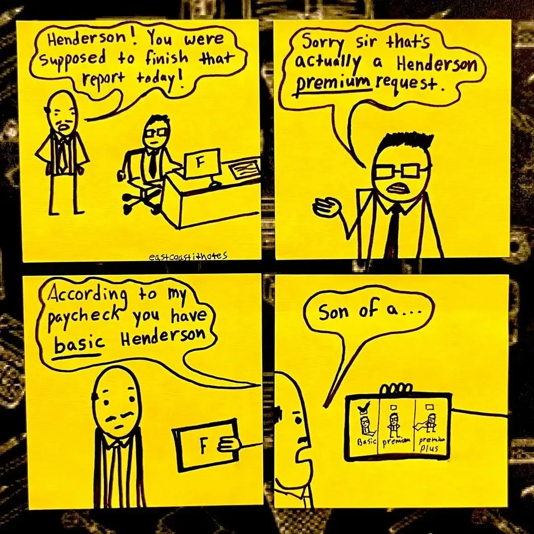 Or maybe is it not a laptop? Maybe it’s just a manila folder, and between the 3rd and 4th panels, he opened it up to show the boss the contents of the folder. But then, I guess it could be one of those tablets that can be used like a laptop, and he’s folded the keyboard around.