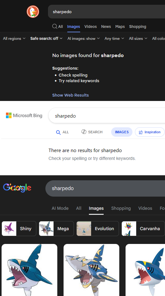 So interestingly, slight misspellings will show the pokemon with a “Showing results for Sharpedo”, but if you click on that link the results will disappear. I also can’t find any other blocked examples with different made up words.