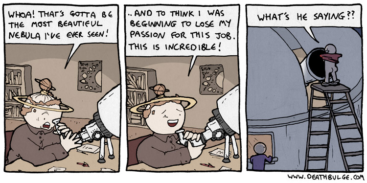 Not to burst the bubble, but i’m pretty sure that, even blocking more than 50% of the aperture, the astronomer still wouldn’t be able to see the person. The astronomer would just see a significantly darker and warped version of the thing behind the person, since the person, much like the various mirror assemblies and mounts inside the telescope, are all wildly out of focus.