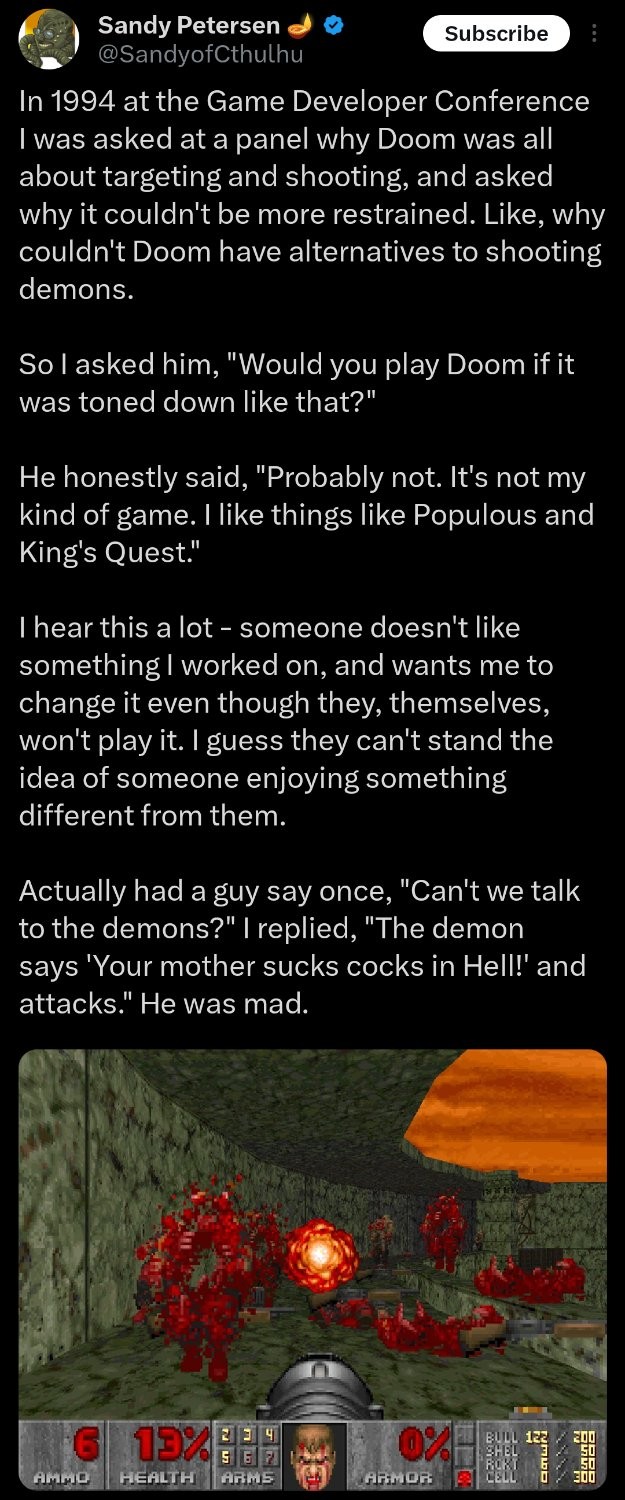 Wasn’t the original vision of Doom closer to an RPG than the action game it came out to be? I know I read somewhere (one of the books written about development of the game) it was originally meant to have a bigger story, multiple characters, dialogue, etc.
