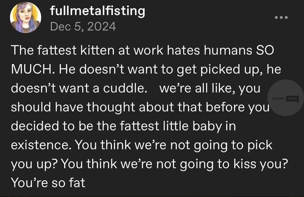 minus-squareMentalEdge@sopuli.xyzlinkfedilinkarrow-up2arrow-down20·edit-27 days agoThat’s… Not what I’m saying. What the fuck? The kitten doesn’t need to stay fat. That’s all. If a pet is getting its food from you, it’s on you to give it the right amount. The same applies to asking a vet for advice, if you don’t know. Bottom line: The health of a pet (or any animal in human care) is the responsibility of the respective human. My second comment initially made ABSOLUTELY NO STATEMENT beyond that fact, or what it means in practice.