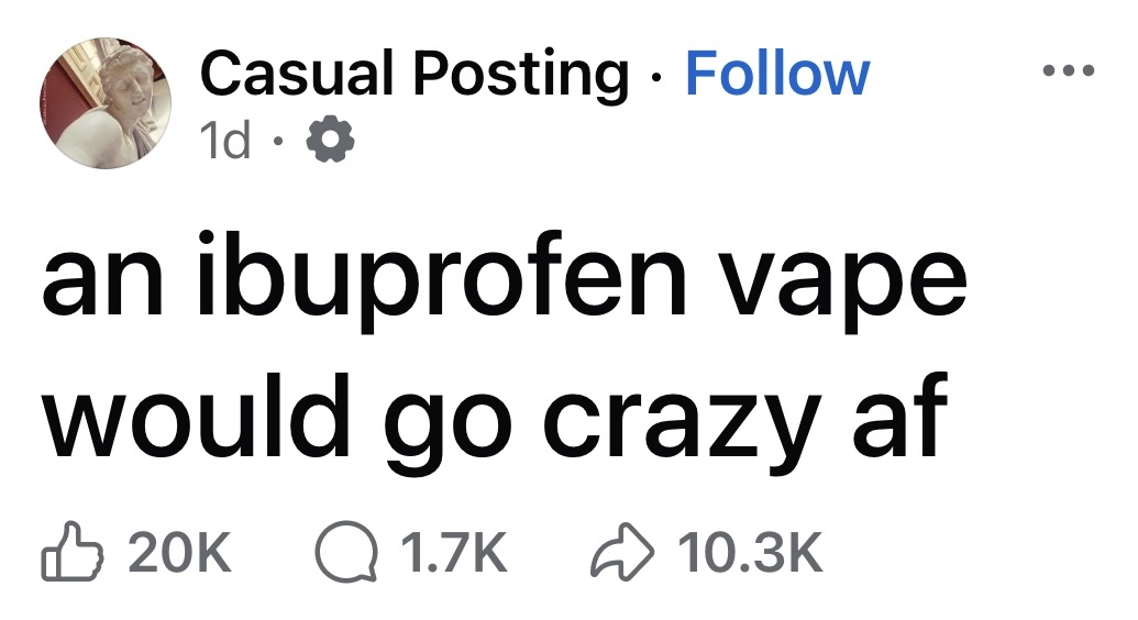 minus-squareTropicalDingdong@lemmy.worldlinkfedilinkarrow-up11arrow-down2·3 days agoThe profen the profen The profen the profen Robocop couldn’t stop me pukin’ and flushin’ No balls to be bustin’, no fightin’, no cussin’ Just love for a drug called I boo profen