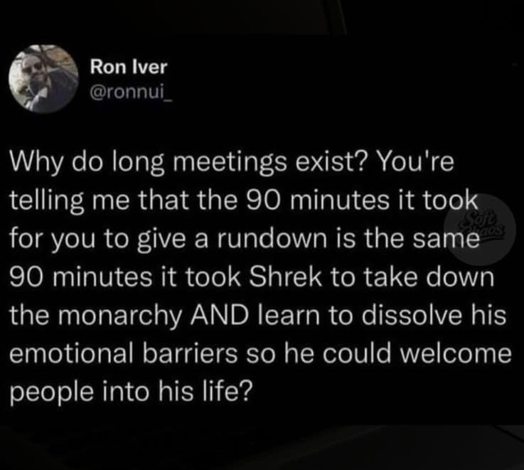 My boss throws a tantrum if anybody is late to his weekly hour long meetings. He spends the first 30 minutes talking about football and asking us what our favorite dishes are.