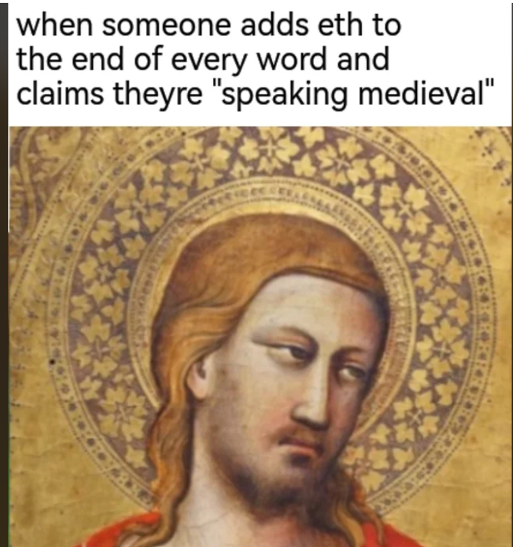 minus-squareOnomatopoeia@lemmy.cafelinkfedilinkEnglisharrow-up14·3 days agoWheneth Someoneth addeth etheth to everyeth wordeth to speaketh medievaleth