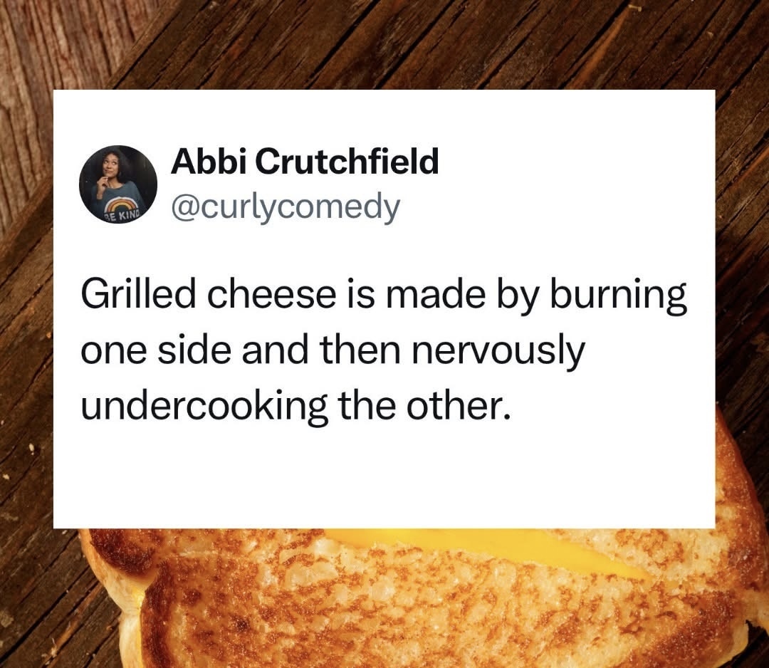 I don’t care if it’s a little charred. American cheese is already probably nice and carcinogenic, so what’s a little more. And don’t tell me to make a grilled cheese with real cheese, that’s just not right.