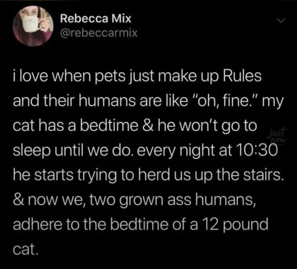 “I have to go home, it’s my cat’s bedtime” is an excuse I gotta keep in my back pocket. Also, it’s probably true, I have one of those cats