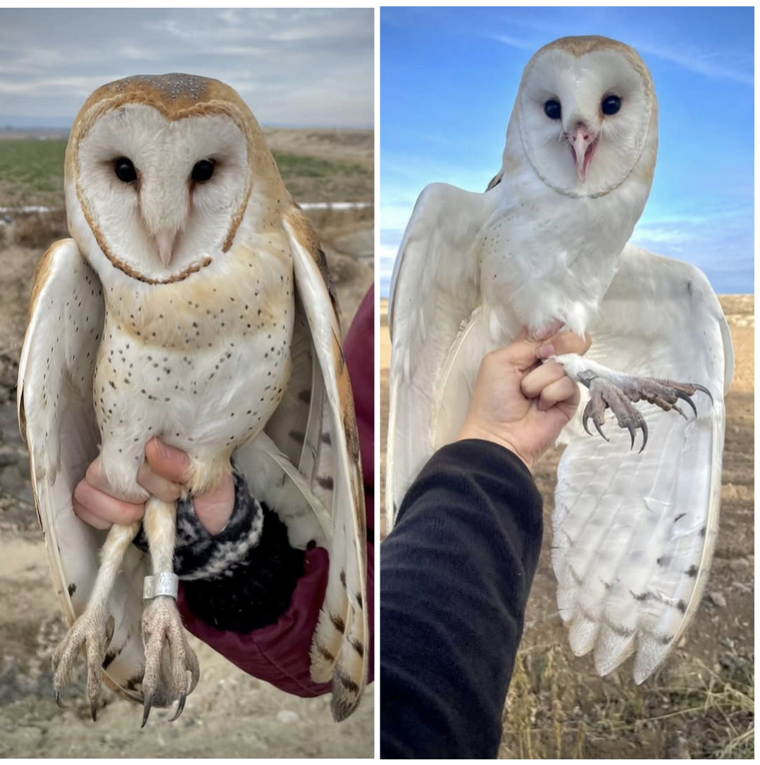 Female Barn Owl on the left has tan breast plumage with many spots, male (on the right) has paler breast in comparison with little to no spotting.