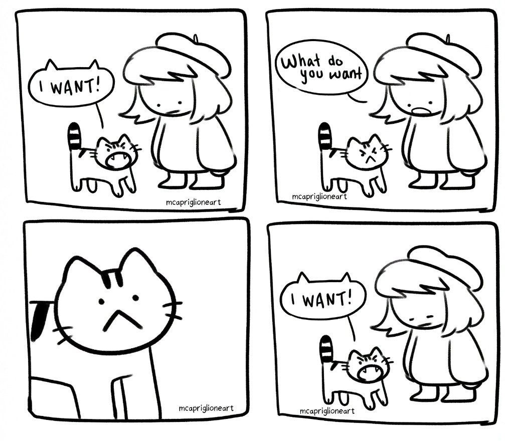 “Meow” basically means “I Want” but most cats’ vocabulary does not extend far enough to finish the sentence.