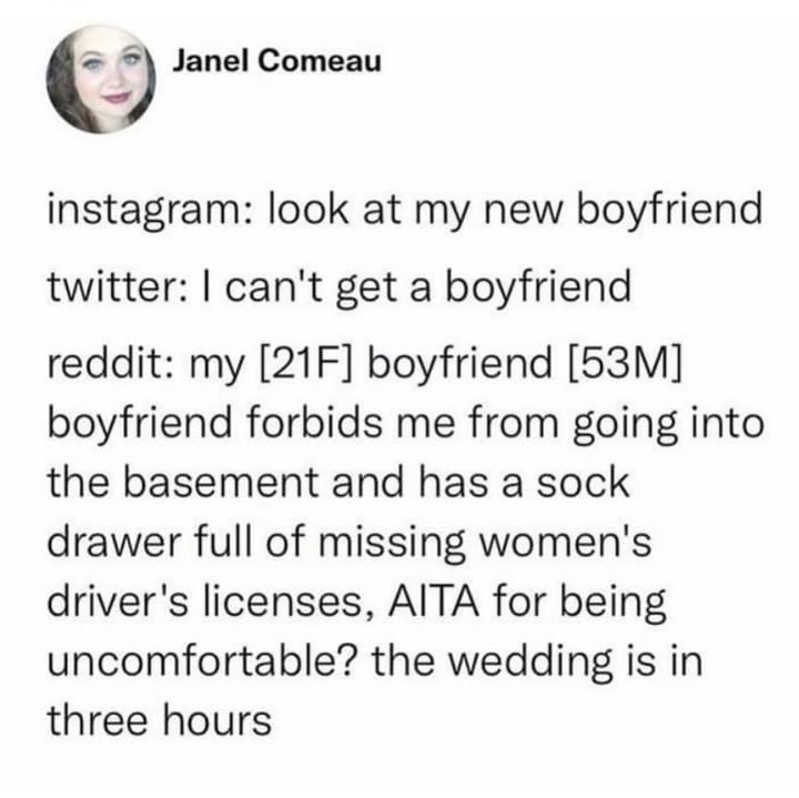 fake. this implies that the poster took the time to figure out that the licenses belonged to missing women. everybody knows that AITA posters can’t do an ounce of work by themselves