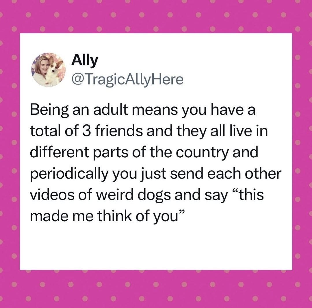 every ‘friend’ i have made as an adult has been nothing more than someone who wants me to be their therapist. so i gave up and I’m much happier w/o people who are constant drags on my well-being.
