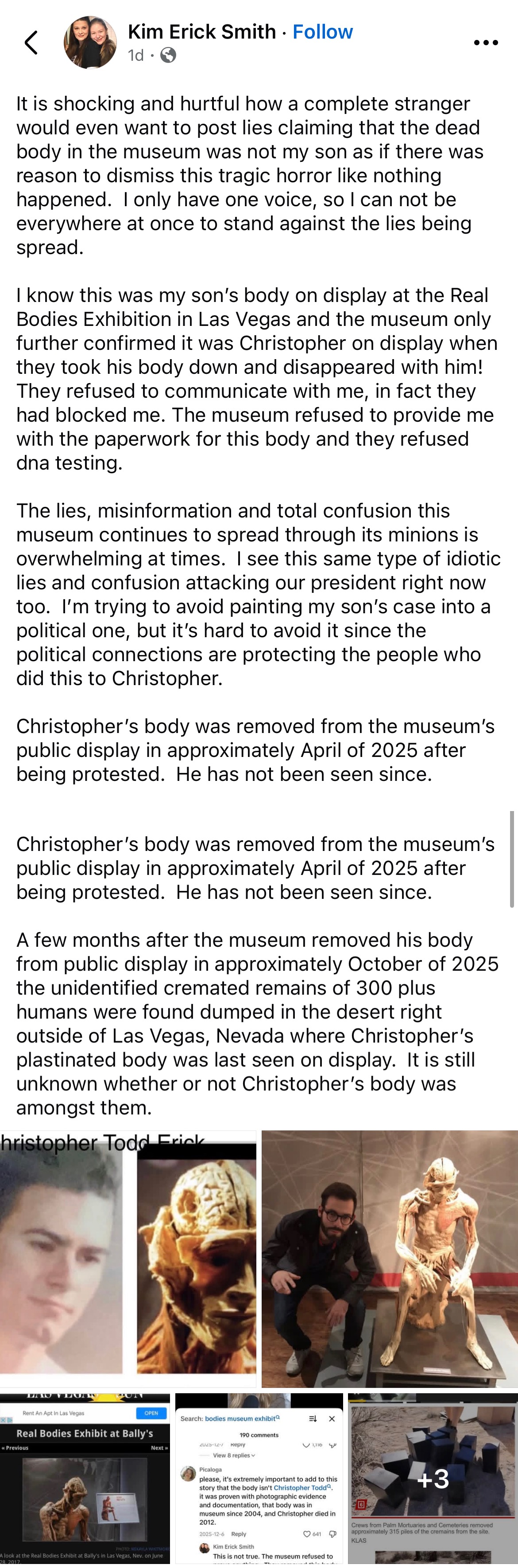 Now, I’m not saying that whatever is being stated in the Facebook post has any merit, but the guy going public (basically inventing the format at around 1995) with these kinds of exhibitions, Gunther von Hagens, came under fire due to corpses of unknown origin being dissected at his institute. He also stocks and trades plastinated specimens (body parts, whole preserved corpses etc.), with documents showing him having around 650 bodies in stock at his facility in China.