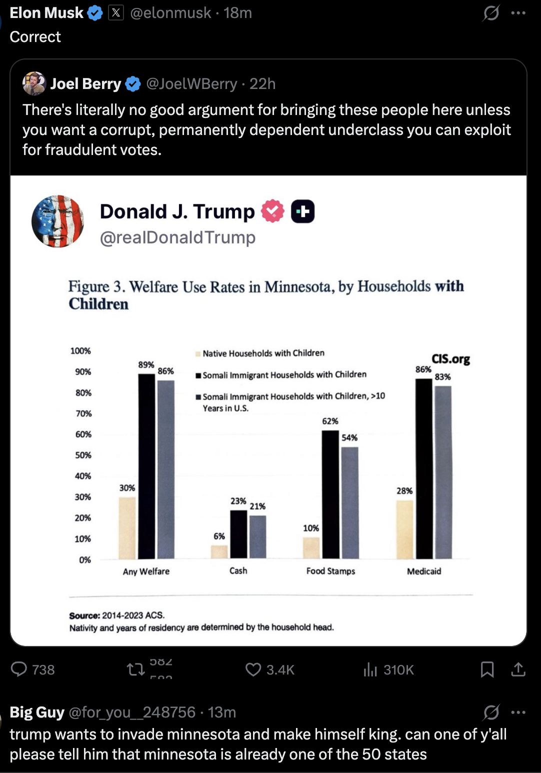 Finally, I am interested in how much government subsidy and tax break Musk and Trump received, and how does that compare to the entire population of somali immigrants “with children” in Minnesota.