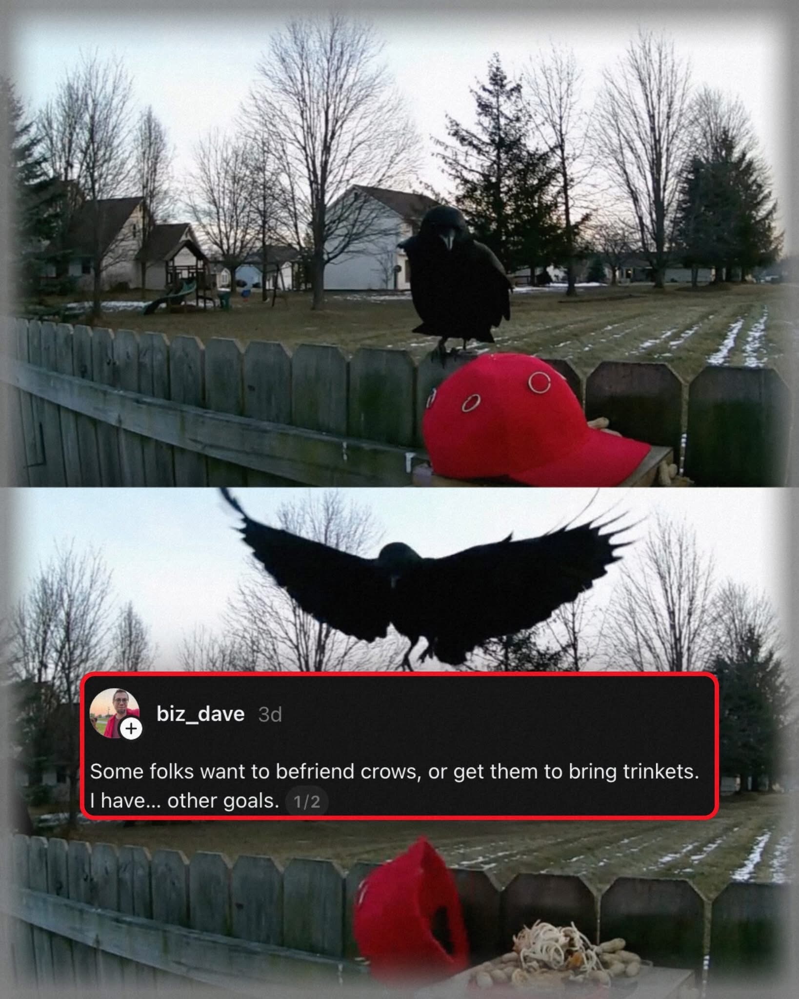I like the spirit behind the idea. I strongly dislike putting crows in harm’s way, 'cuz we all know a sizable chunk of MAGA fucks wouldn’t feel a shred of remorse if they managed to get hold of a crow that went after their hat, or otherwise just pulled out a gun and shot them.