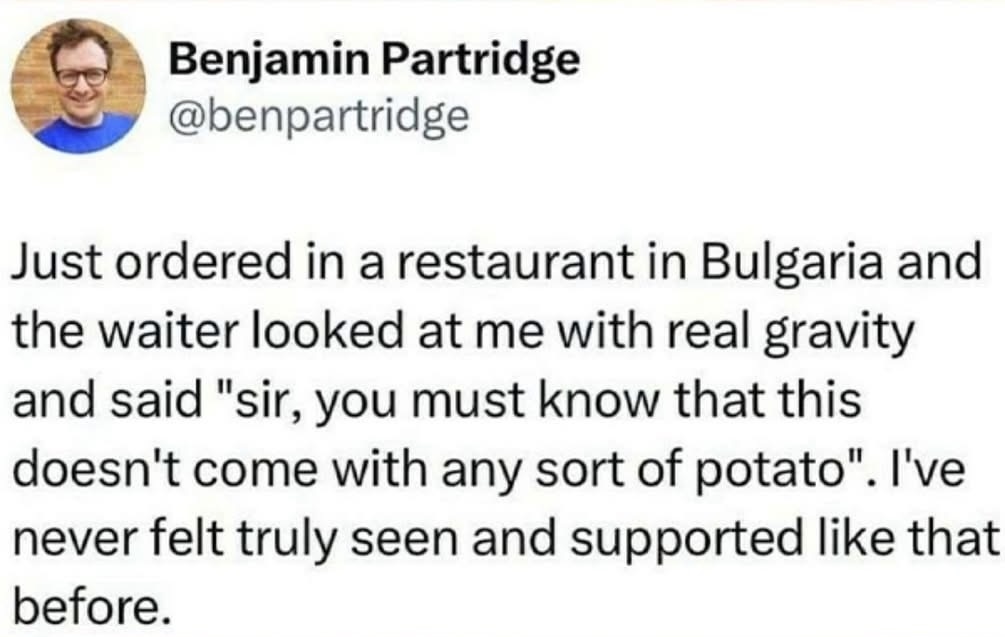 PSA this is correct. Any bread, potato etc has to be ordered separately in Bulgaria, but the waiters ask if you’d like any in case you forget, so you’re safe.