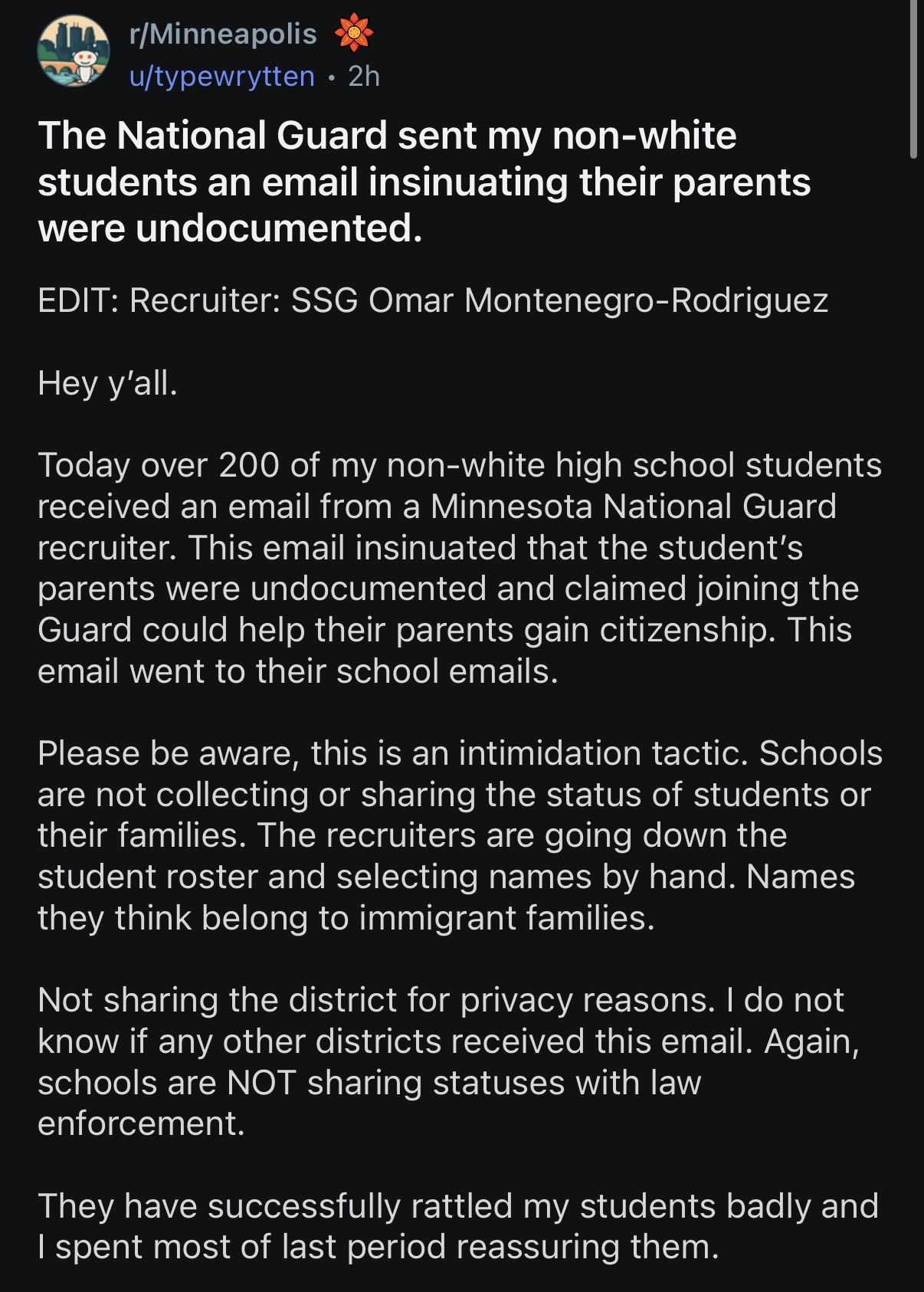 arrow-up1393arrow-down1external-linkThe Minnesota National Guard is attempting to recruit high school kids by insinuating their parents might be deported if they don't sign uppbs.twimg.comdestructdisc@lemmy.world to A Boring Dystopia@lemmy.world · 2 days agomessage-square20fedilinkfile-text