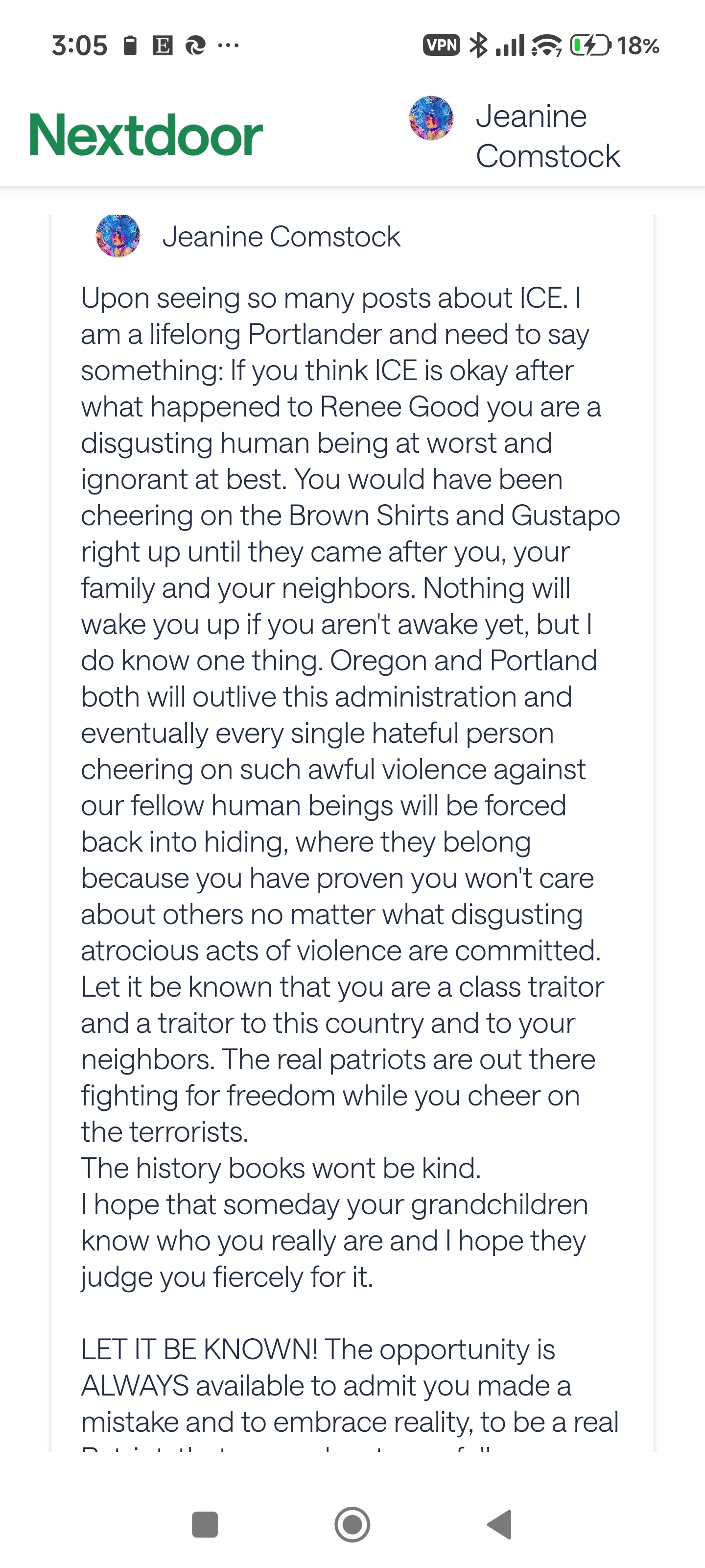 I just want to say a few words because I got banned from my local NextDoor app and Reddit 2x because I get so sick of seeing so many pro-ICE class traitors cheering on the abuse thats occuring in our neighborhoods and communities in the Unites States! These same people claim to be patriots as you realize they are the same people that would have snitched on Ann Frank ffs!