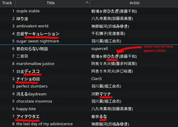 ~/.config/fontconfig/fonts.confto Droid Sans Fallback (I also tried setting it to Noto Sans CJK Light), then confirming changes usingfc-match. Restarted and clearedfc-cache. Dolphin and Strawberry did not respect my changes. Nautilus does though. (Qt issue?) - Replaced CJK VF fonts with non-VF fonts. No difference.