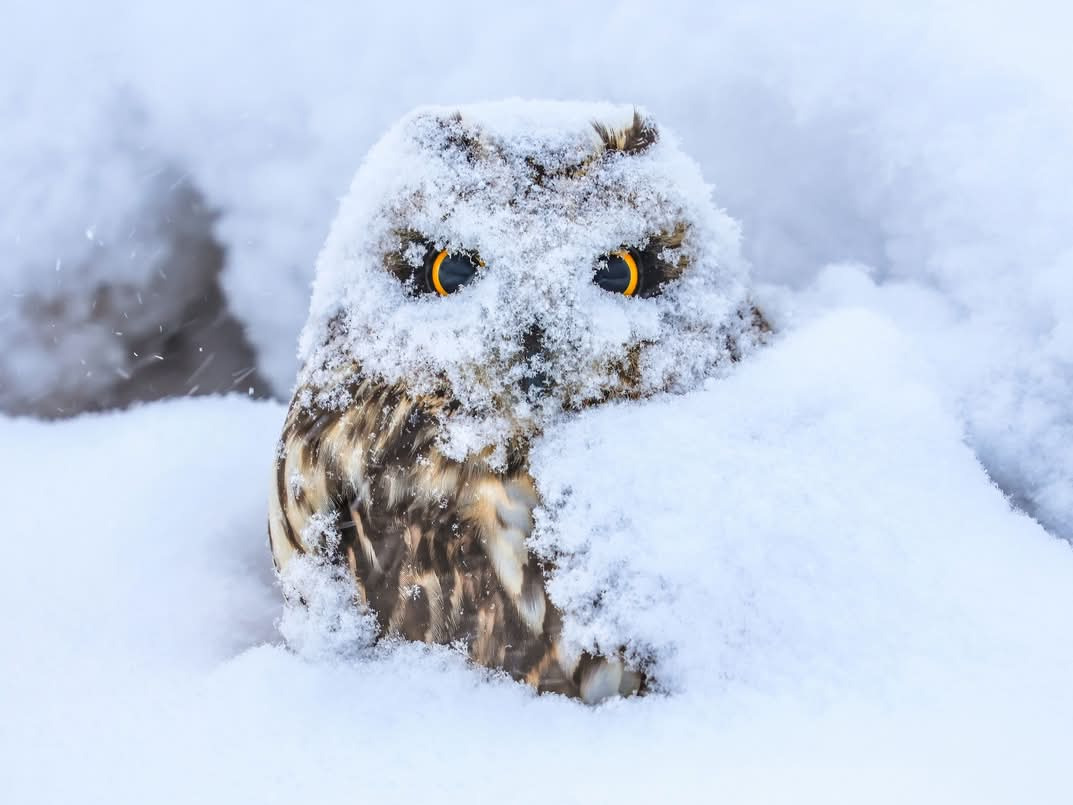 A short-eared owl enduring a windy snow storm in Battle Creek, Michigan. I was able to capture this amazing moment with my Canon gear from 15 feet away! As I was out in the early morning, I noticed a couple dark blobs in the snow.