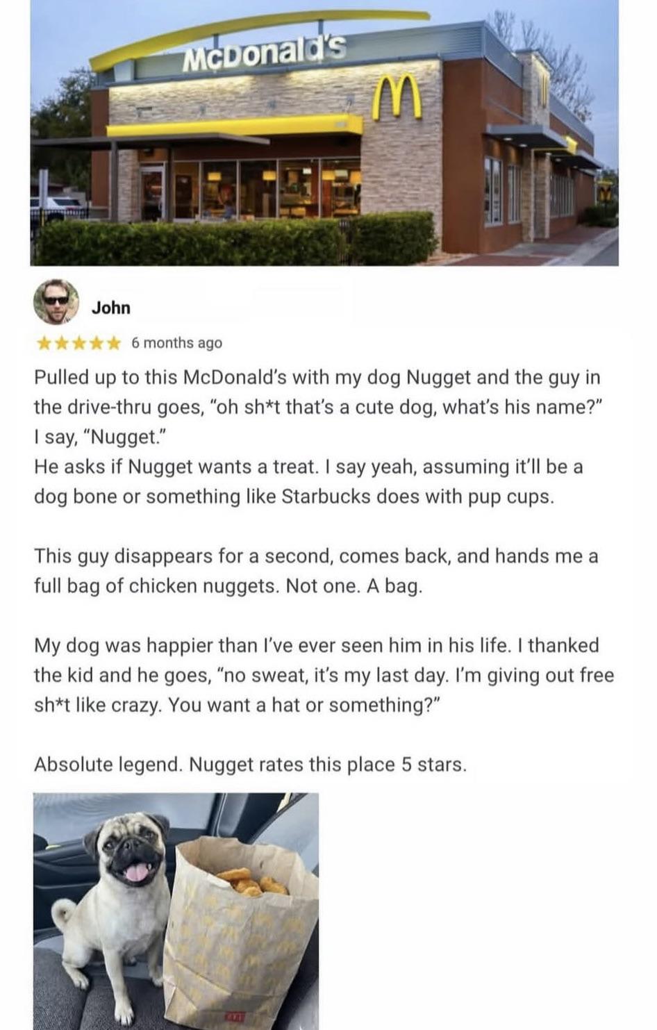 I could see quitting guy slowly putting extra nuggies in a bag for himself over the course of the day and decided to hand it over to dog dude because he liked the name ¯\_(ツ)_/¯