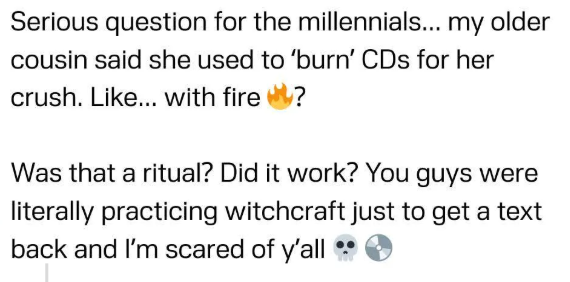 Though I am old enough to remember the more ancient cassette magics. Those required precise mixing rather than burning, and were much more archaic, sometimes involving transcribing messages from the very ether.