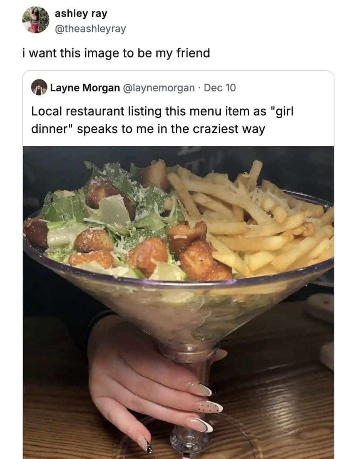 This has nothing to do with the original concept/internet meme of “girl dinner”, this is just salad and fries. Girl dinner is like… six olives and an entire sleeve of crackers with peanut butter directly out of the jar. Girl dinner is three slices of cheddar cheese, and an entire bag of baby carrots with hummus. If you have the emotional capacity to cook fries and mix a salad, that is not girl dinner, thats just dinner. This is capitalism using buzzwords without understanding what they’re saying and I’m irrationally annoyed by this one in particular because I fucking love Girl Dinner.